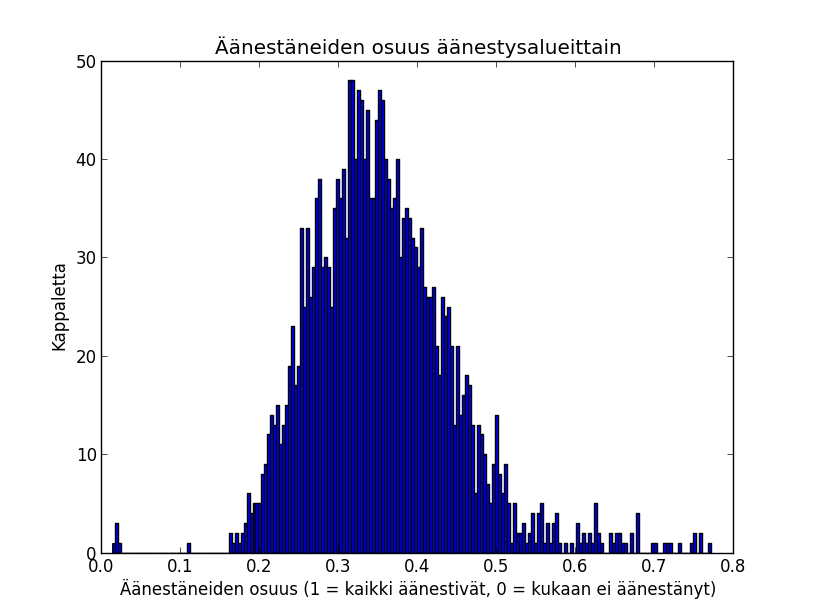 Aanestaneiden_osuus_aanestysalueella_HIST200Figure 3. Histogram of ratio of voters to eligible voters for each voting area. If the abscissa is multiplied by 100 it gives percents.  in more detail: for each voting area the number of voters on election day was divided by the number of those eligible to vote in Finland, those who voted before the actual election day are not included.