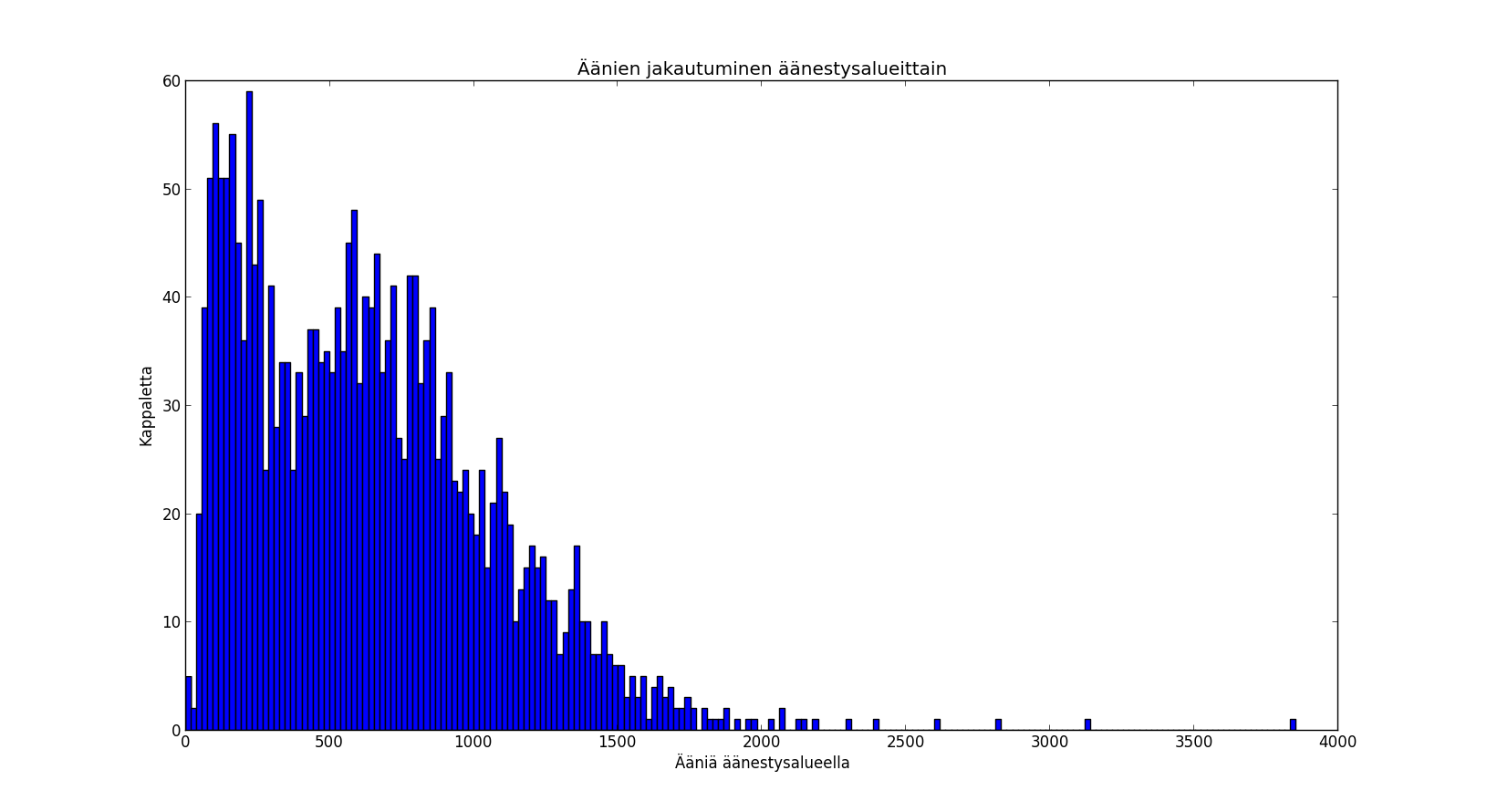 Aania_aanestysalueella_HIST200Figure 2. Size of voting areas and turnout vary. For example little over 3000 votes were cast in one area. Abscissa is the number of votes given on an area, ordinate is the count of areas.
